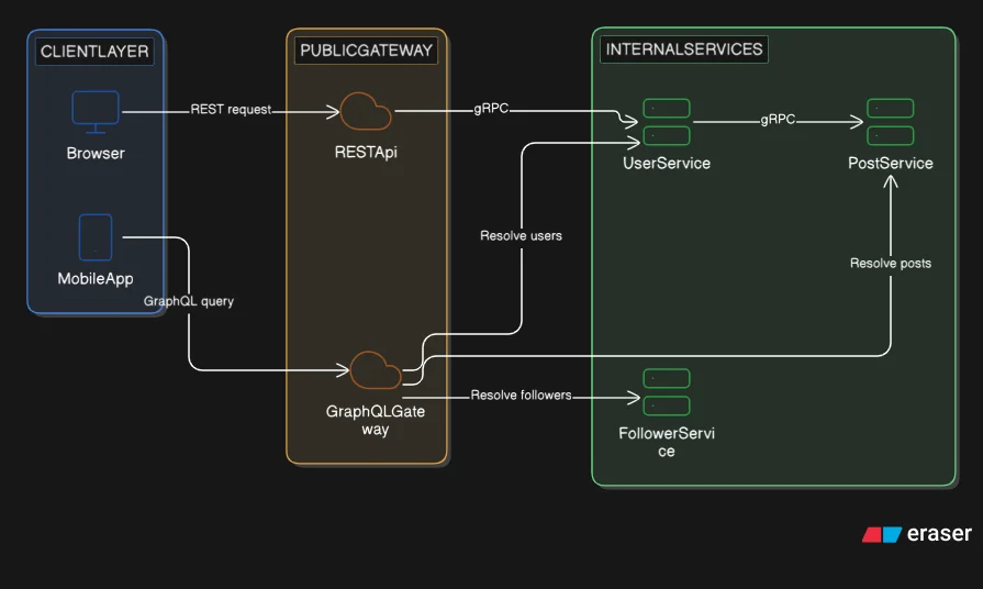 gRPC fits internal service-to-service communication. When a recommendation service calls a user service, or a checkout service calls an inventory service, gRPC provides stronger typing, better performance, and explicit streaming support. The performance advantage is most meaningful where call frequency is high or where streaming semantics are required.