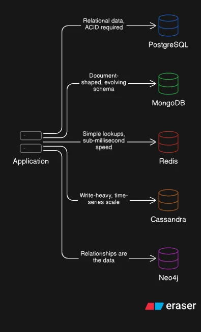 Most systems use more than one database. A single database is a starting point. When we introduce caching layers, event streaming, and search later in this series, each component will bring its own storage model.